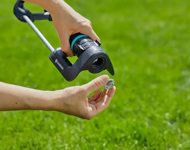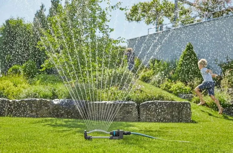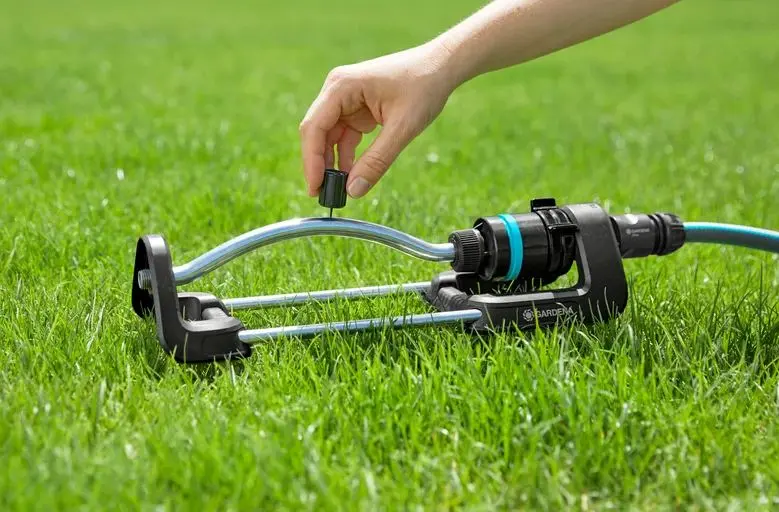 - Plaats de sproeier gewoon op het gazon, sluit hem aan op de slang die op de kraan is aangesloten en zet het water aan