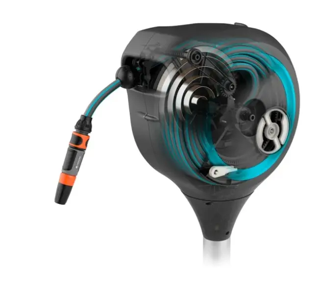 - Dankzij de geïntegreerde slanggeleiding kan de tuinslang onder andere gelijkmatig worden ingetrokken zonder te knikken of in de knoop te raken